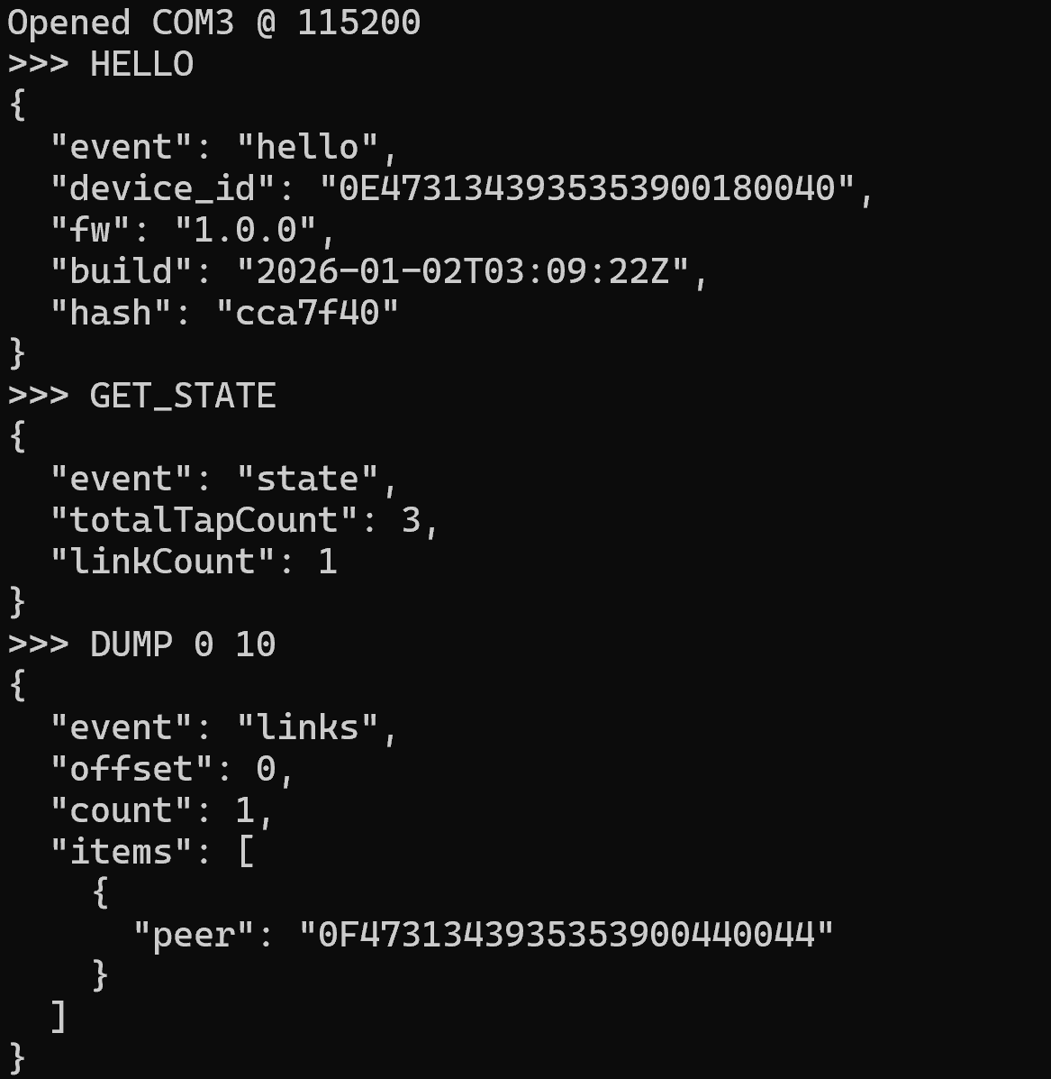 SIGN_STATE nonce_hex - Signs the current state with HMAC-SHA256 for server-side verification. The HMAC covers the device ID, nonce, tap count, link count, and all peer IDs.